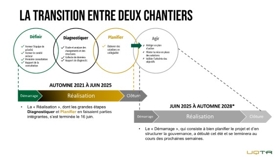 Nous traversons actuellement une période de transition marquée par la clôture de la phase « Planifier » et le démarrage de la phase « Agir ». Cette étape de démarrage, amorcée cet été et prévue pour se conclure dans les prochaines semaines, vise à planifier le projet de manière rigoureuse, définir les balises, structurer la gouvernance et établir les prochaines actions à entreprendre.