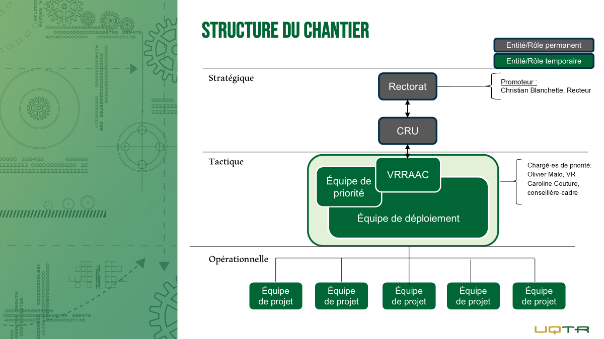 L’équipe de priorité assurera la gestion globale du chantier en planifiant les ressources, en suivant le plan d’action et en pilotant les stratégies de transformation organisationnelle.