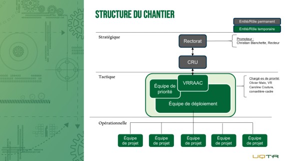 L’équipe de déploiement, composée de représentants de tous les groupes d’emploi, travaille en collaboration étroite avec l’équipe de priorité. En s’appuyant sur les principes fondateurs et les conclusions du chantier institutionnel sur les structures de gestion académique, le mandat de l’équipe de déploiement octroie à ses membres l’espace pour contribuer aux travaux visant la mise en œuvre de la restructuration. Ceux-ci veilleront à la fois à s’inspirer des meilleures pratiques et à maintenir l’identité de l’UQTR.