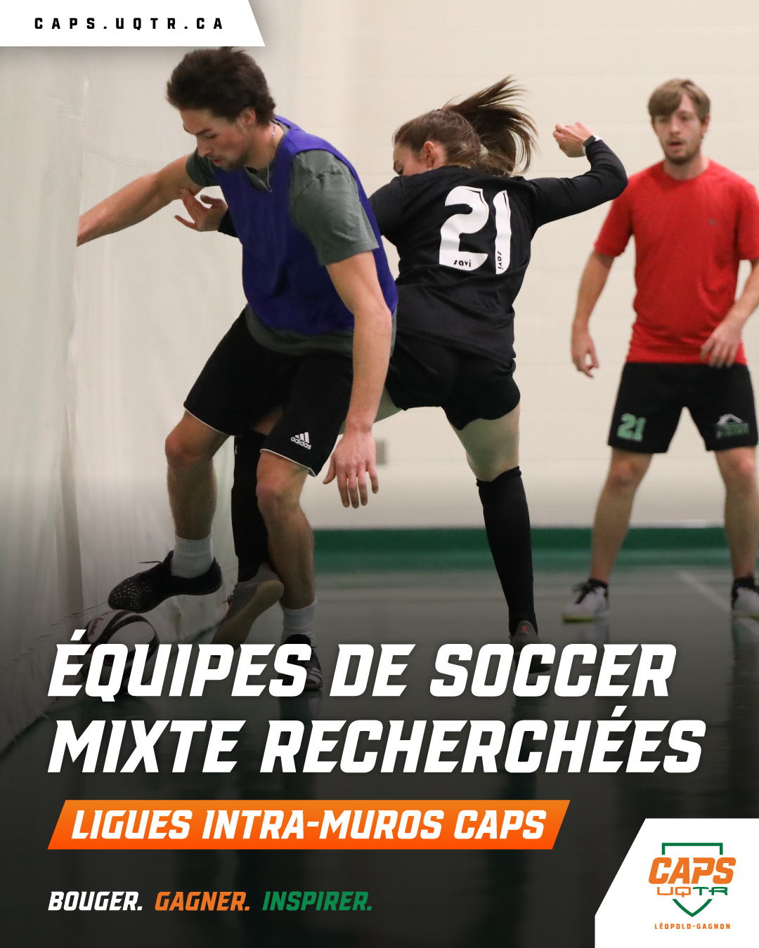 La période d’inscription pour la ligue intra-muros de soccer mixte au CAPS Léopold-Gagnon est ouverte et se terminera le vendredi 9 janvier! Profite de la fin de la session pour former ton noyau de joueurs!