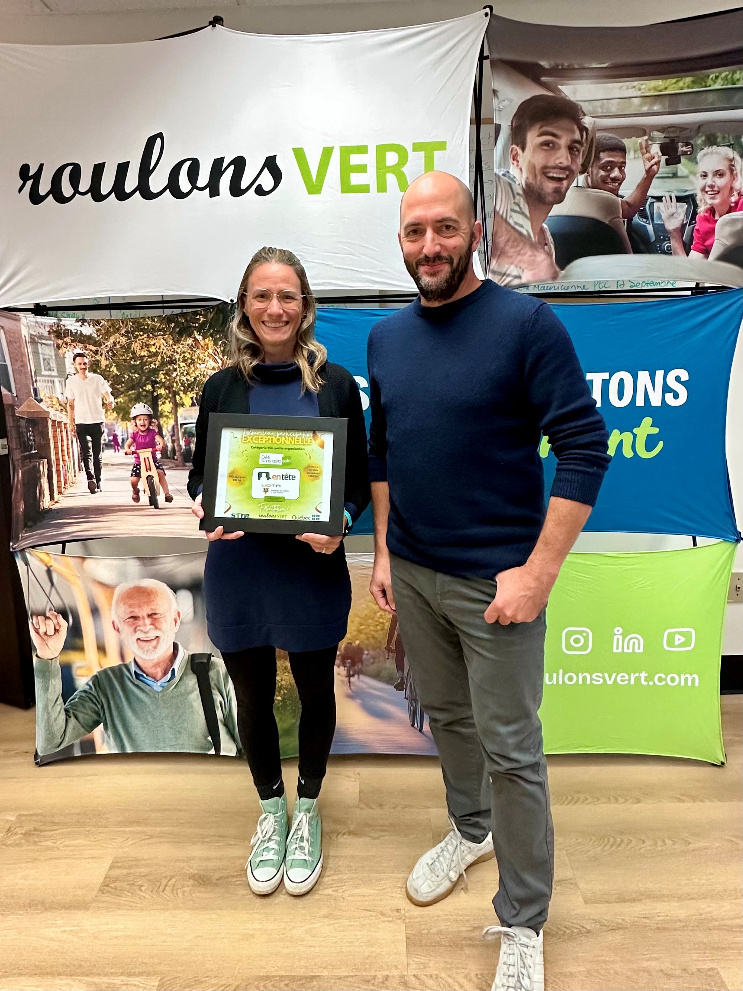 Dans notre plan d’action, nous avons choisi de miser sur la sensibilisation de notre équipe. Après avoir analysé nos pratiques quotidiennes, nous avons constaté que l’empreinte carbone directe de nos actions quotidiennes était plutôt faible. Par contre, au niveau des déplacements individuels en voiture, nous avons évalué qu’il était possible d’avoir un impact de réduction significatif. Nous avons donc décidé de relever, en équipe, le Défi sans auto solo. Pendant un mois entier, nous avons pu découvrir des alternatives de transport et les tester. Des collègues ont fait du covoiturage, d’autres ont testé le vélo ou la marche pour se rendre au travail. Ce défi a également permis de mesurer les gaz à effet de serre que nous avons évités par nos actions ! Total : 886 kg de CO2 équivalent, ce qui équivaut à un aller, en avion Montréal – Vancouver.
