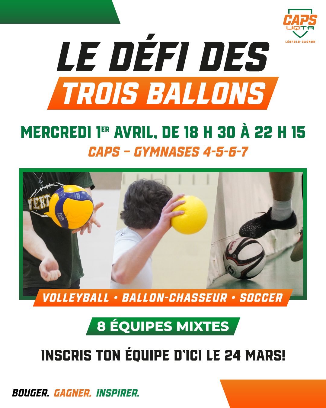 Le Centre de l’activité physique et sportive Léopold‑Gagnon est fier d’annoncer la toute première édition du Défi des trois ballons, un tout nouvel événement multisport combinant trois disciplines aussi dynamiques que populaires: le volleyball, le ballon‑chasseur et le soccer. L’événement aura lieu le mercredi 1er avril, de 18h30 à 22h15, dans les gymnases 4-5-6-7 du CAPS.