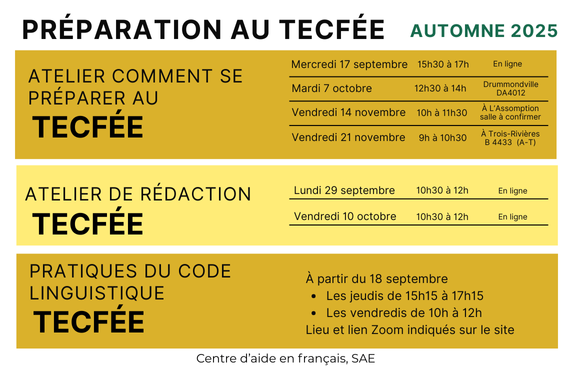 Te prépares-tu pour la partie rédaction de ton TECFÉE? Tu as sûrement besoin de soutien. Le Centre d’aide en français t’offre plusieurs services et ressources pour t’accompagner.