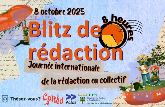 Dans le cadre de la Journée internationale de la rédaction en collectif, joignez-vous à nous pour un Blitz de rédaction de 8 heures à l’Espace Cycles supérieurs de la bibliothèque du campus de Trois-Rivières, à la salle collaborative du campus de Drummondville ou en ligne!
